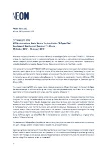• NEON, founded in 2013 by collector and entrepreneur Dimitris Daskalopoulos, works to bring contemporary culture closer to everyone, in the firm belief in the ability of contemporary artistic creativity to rouse, emotionally move and motivate. It also aims to contribute to the wider efforts being made to revitalise the city and inspire the daily lives of its citizens. NEON does not restrict itself to just one space. It activates public spaces in Athens and the periphery. NEON advocates all institutions which are established in the field of learning, new productions and the dialogue with the city.