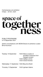• NEON, founded in 2013 by collector and entrepreneur Dimitris Daskalopoulos, works to bring contemporary culture closer to everyone, in the firm belief in the ability of contemporary artistic creativity to rouse, emotionally move and motivate. It also aims to contribute to the wider efforts being made to revitalise the city and inspire the daily lives of its citizens. NEON does not restrict itself to just one space. It activates public spaces in Athens and the periphery. NEON advocates all institutions which are established in the field of learning, new productions and the dialogue with the city.